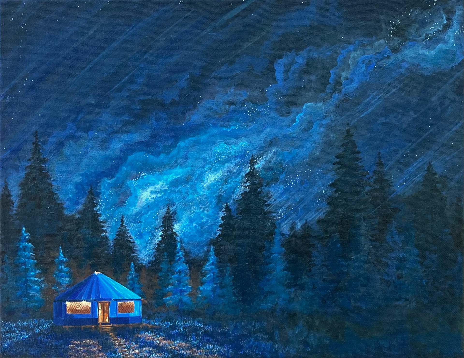 This painting was done for a friend, and while I had reference photos of their yurt, this was largely my own composition. I was inspired by the landscape their yurt sits in and I loved the idea of showing their little cabin as a beacon of light and full of warmth.